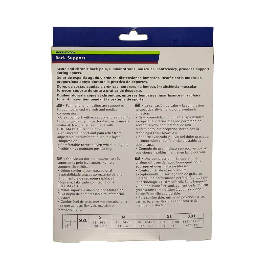 Description: Actimove Back Support with 4 Stays and Adjustable Double Layer Compression is designed for pain relief and healing, supported through balanced warmth and medical compression. The compression properties for support and stability help reduce swelling and manage pain relief. The 4 stays offer advanced support, pain relief, and comfort. The COOLMAX AIR technology in the material is breathable and soft, allowing your skin to breath and moisture to release.