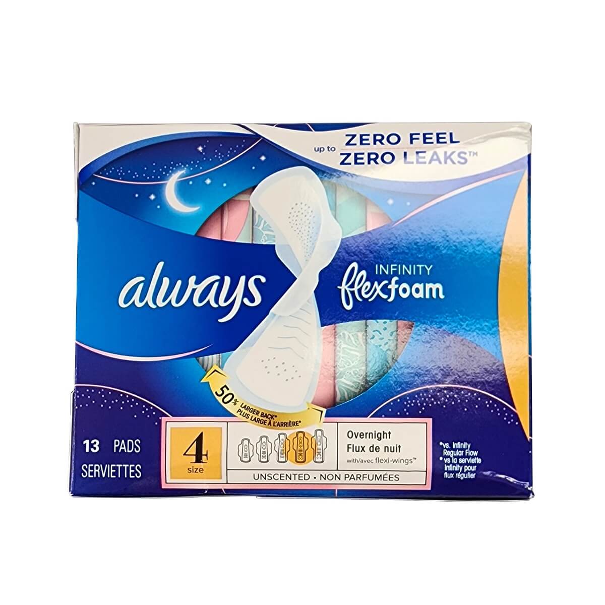 Description: Always Infinity with FlexFoam Overnight Size 4 are designed to provide you with overnight protection and comfort. These pads incorporate Always's FlexFoam technology to seamlessly conform to your body. It can absorb 10x its weight and provides up to 12 hours of zero leaks and zero feel. The top layer is breathable, allowing you dry comfort through the night.