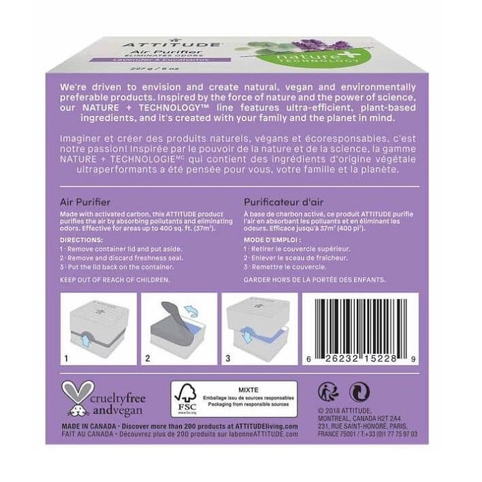 Description: ATTITUDE’s Nature+ Natural Air Purifier features activated charcoal, which can trap airborne pollutants and contaminants to help purify your home – naturally! In addition to charcoal, this purifier also contains resin to remove odors for long lasting effect. With natural ingredients that are plant and mineral based, this air purifier is scented with lavender and eucalyptus to to bring a soothing scent to your home. This air purifier can be used for up to 6 weeks (depending on room size).