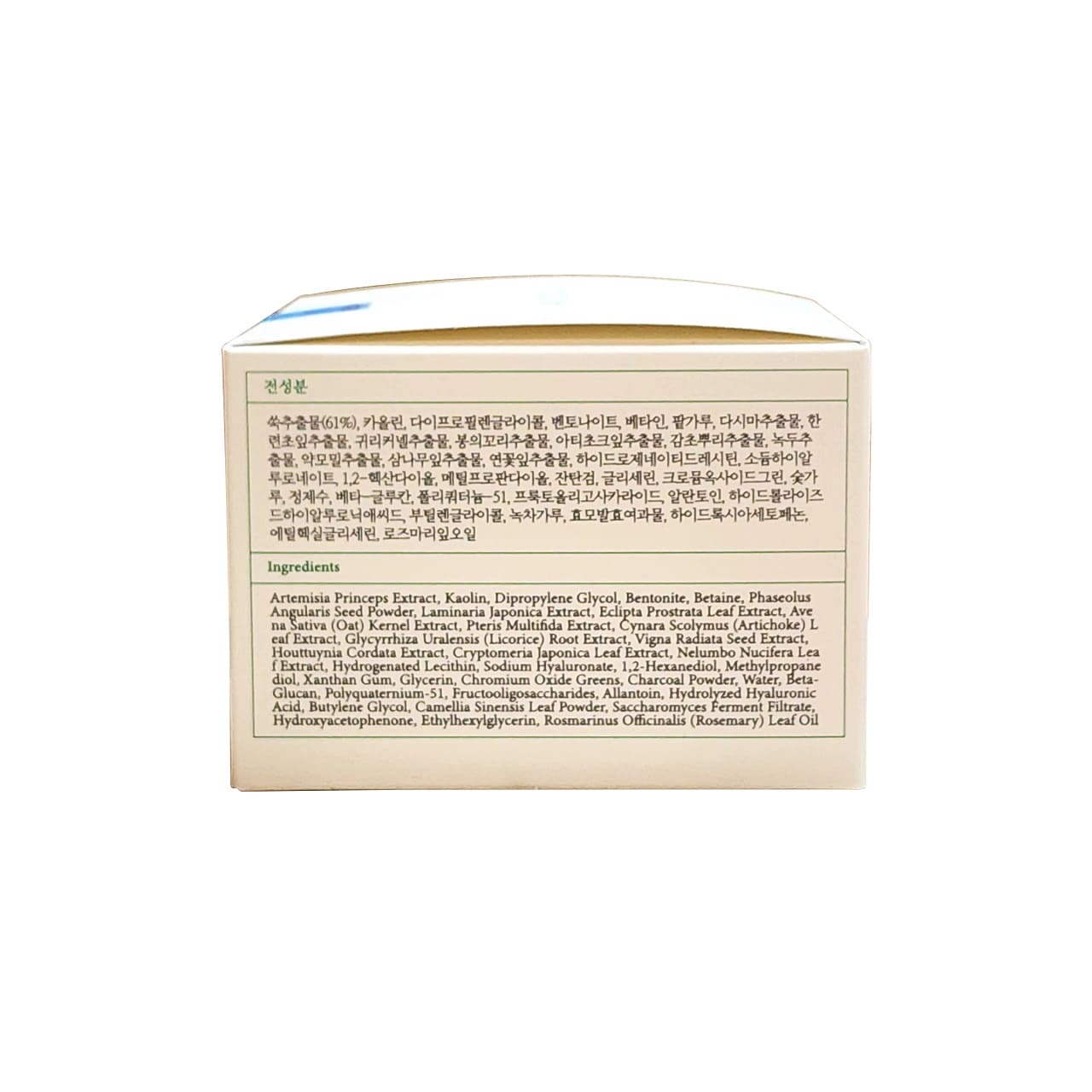 Ingredients: Artemisia Princeps Extract, Kaolin, Dipropylene Glycol, bentonite, Betaine, Phaseolus Angularis Seed Powder, Laminaria Japonica Extract, Eclipta Prostrata Leaf Extract, Avena Sativa (Oat) Kernel Extract, Pteris Multifida Extract, Cynara Scolymus (Artichoke) Leaf Extract, Glycyrrhiza Uralensis (Licorice) Root Extract, Vigna Radiata Seed Extract, Houttuynia Cordata Extract, Cryptomeria Japonica Leaf Extract, Nelumbo Nucifera Leaf Extract, Hydrogenated Lecithin, Sodium Hyaluronate, 1,2 Hexanediol, Methylpropanediol, Xanthan Gum, Glycerin, Chromium Oxide Greens, Charcoal Powder, Water, Beta-Glucan, Polyquaternium-51, Fructooligosacchardies, Allantoin, Hydrolyzed Hyaluronic Acid, Butylene Glycol, Camellia Sinensis Leaf Powder, Saccharomyces Ferment Filtrate, Hydroxyacetophenone Ethylhexylglycerin, Rosmarinus Officinalis (Rosemary) Leaf Oil