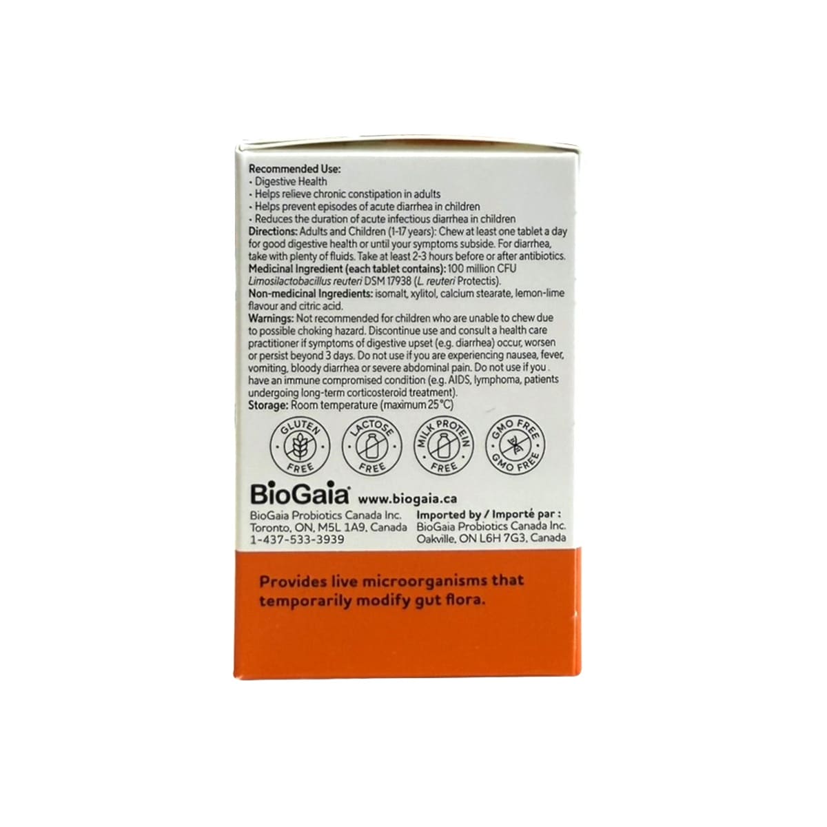 Active Ingredients: 100 million live active Lactobacillus reuteri DSM 17938 (Lactobacillus reuteri Protectis)