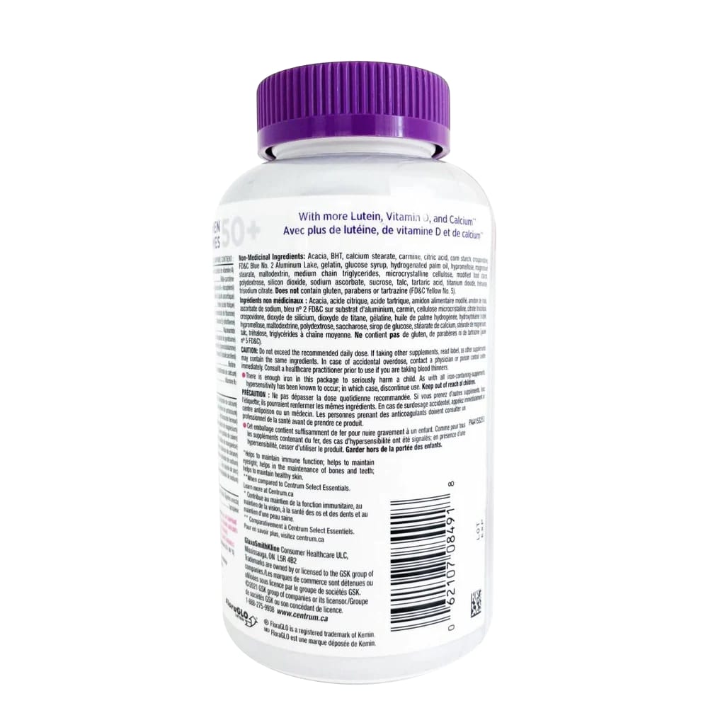Description: Centrum Women 50+ is formulated to address the nutritional needs of Women age 50+. It contains more Lutein, Calcium, and Vitamin D, compared to Centrum Select Essentials 50+, which is designed for all consumers age 50+. This formula for women age 50+ is intended to help maintain bone and teeth, help maintain proper eyesight and healthy skin, and help support the immune system.