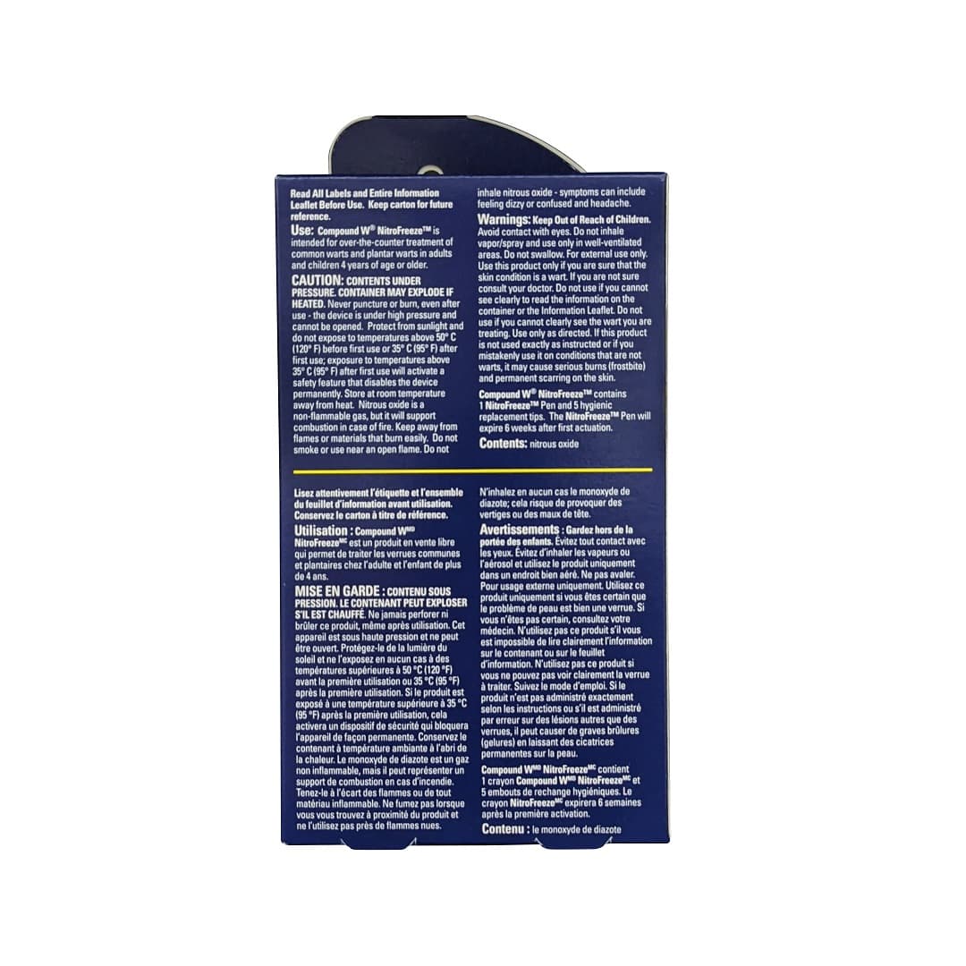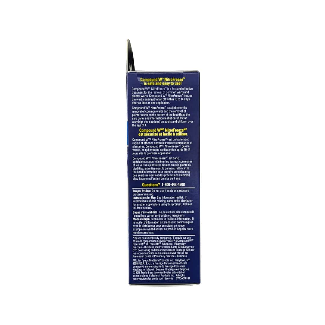 Description: Compound W Nitro Freeze Spray is a fast and effective treatment for the removal of common warts and plantar warts. Compound W Nitro Freeze Spray freezes the wart, causing it to fall off within 10 to 14 days, after as little as one application.