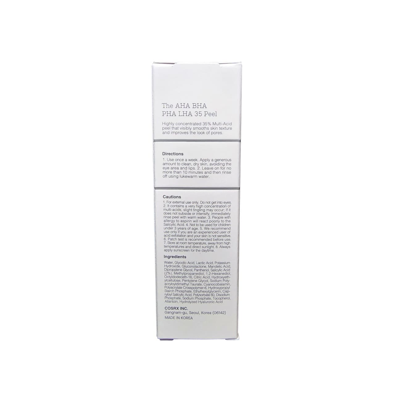 Description: COSRX The AHA BHA PHA LHA 35 Peel is a highly concentrated 35% multi-acid peel that visibly smooths skin texture and improves the look of pores. The blend combines glycolic acid, lactic acid, mandelic acid, and salicylic acid to exfoliate the skin, unclog pores, and reduce the appearance of fine lines.