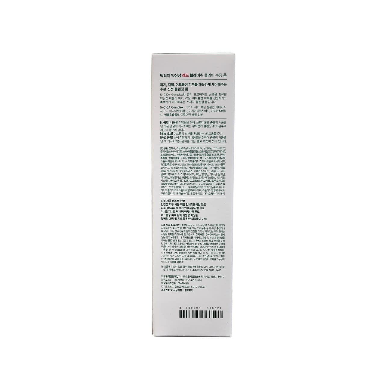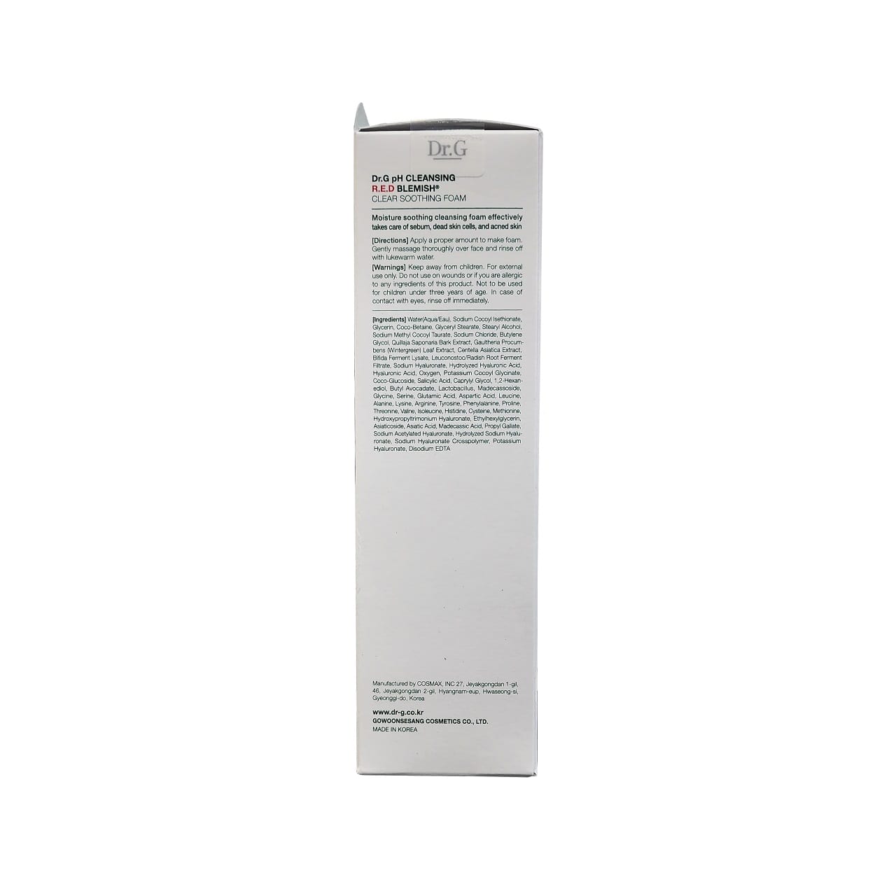 Description: Dr.G pH Cleansing R.E.D. Blemish Clear Soothing Foam is a moisturizing, soothing cleansing foam that effectively dissolves impurities and takes care of sebum, dead skin cells, and acne-proned skin. It features a 5-Cica Complex, which helps to protect the skin barrier, reduce inflammation, and promote the skin's natural healing effect; 8 hyaluronic acids, which help to lock in moisture and maintain long-lasting hydration; and bifida ferment and amino acids, which help boost skin elasticity.