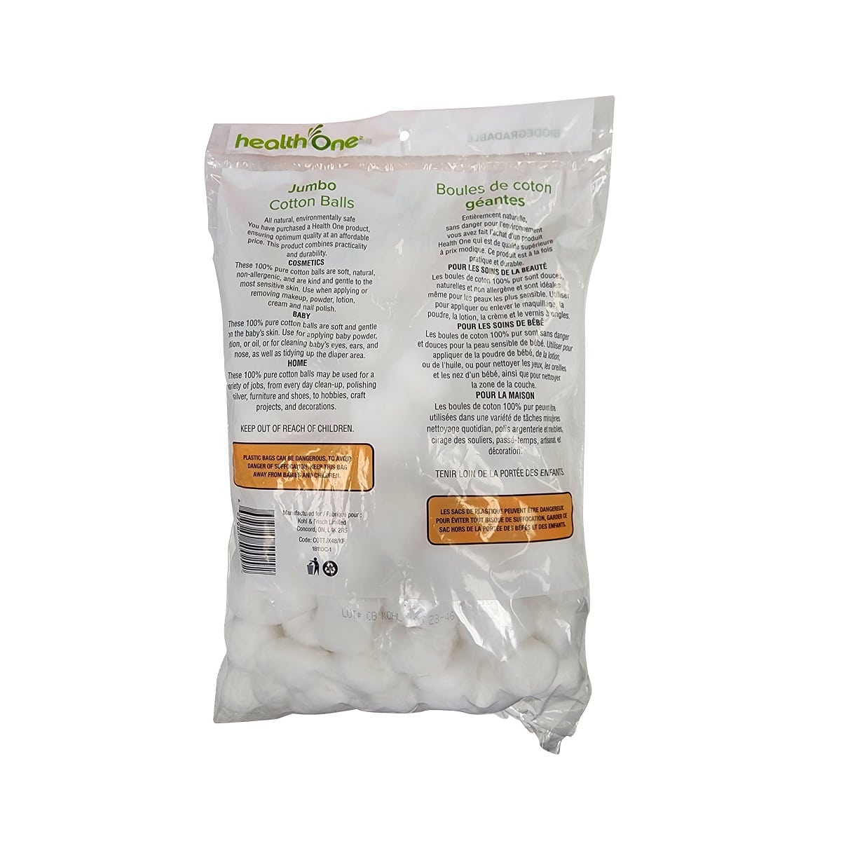 Description: health One Cotton Balls Jumbo Size are made with 100% pure cotton. They are soft, natural, non-allergenic, and gentle to the most sensitive skin. These cotton balls are great for cosmetics, baby use, and home use: