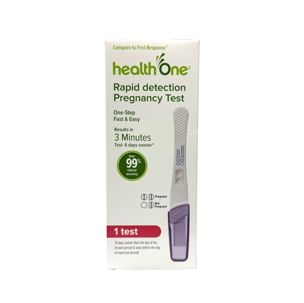 Description: health One Rapid Detection Pregnancy Test is a one-step, fast, and easy to use pregnancy test that has over 99% clinical accuracy. Simply hold the absorbent tip in your urine stream for at least 5 seconds. This test is designed for use in the comfort of your own home.