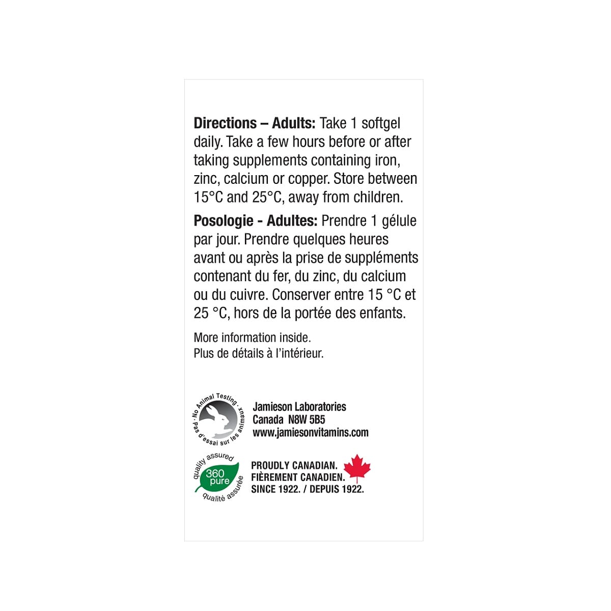 Recommended Dosage for Adults: Take 1 softgel daily. Take a few hours before or after taking supplements containing iron, zinc, calcium, or copper.