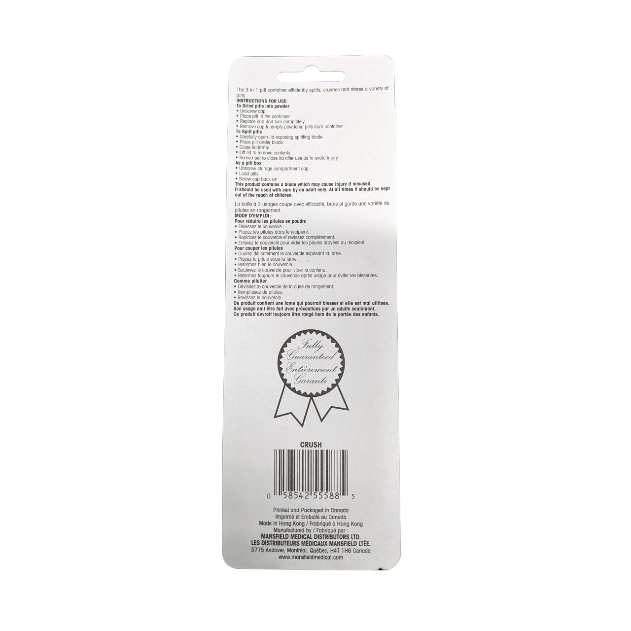 Description: Mansfield 3-in-1 Pill Crusher/Splitter/Box effectively splits, crushes, and stores a variety of pills.