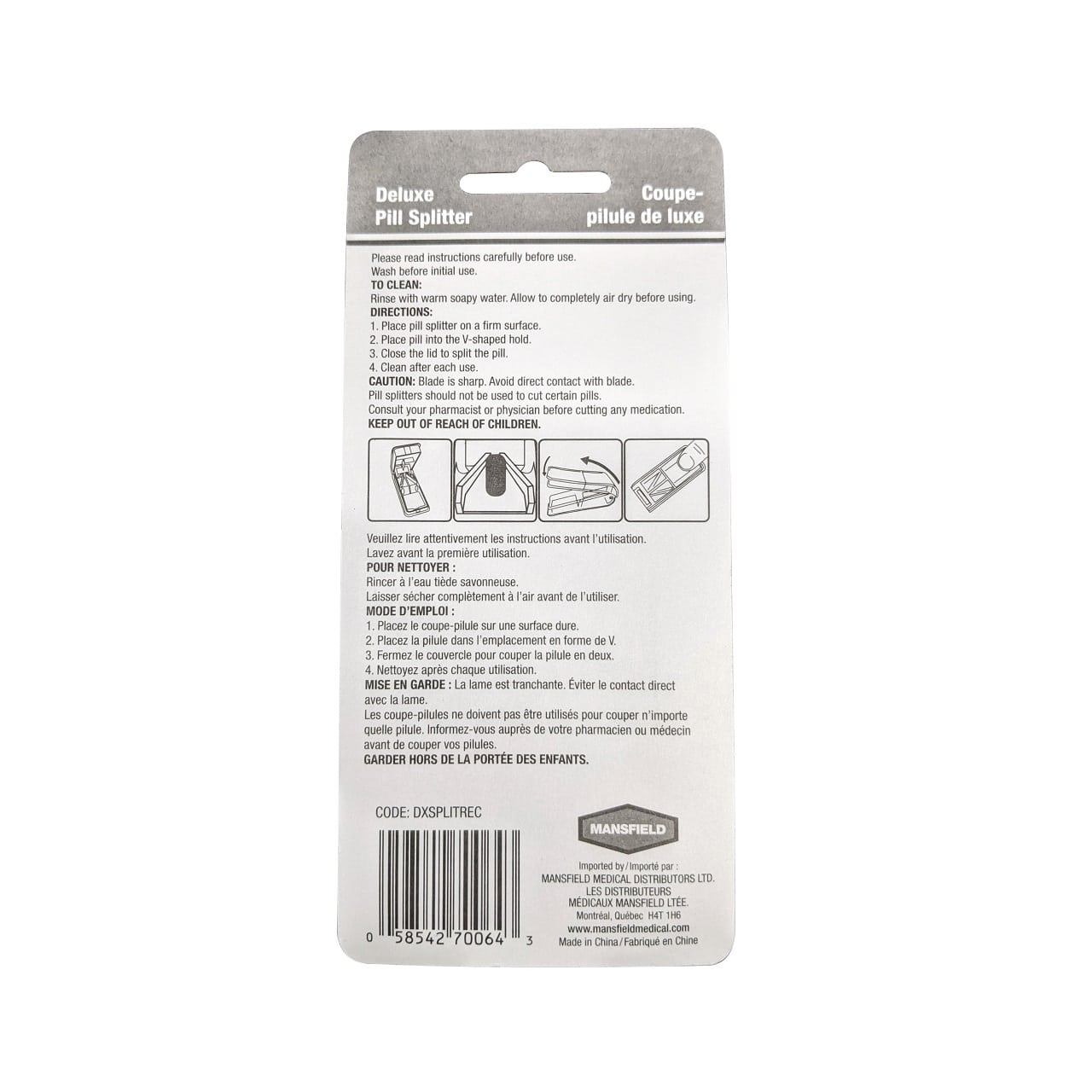 Description: Mansfield Deluxe Pill Splitter effective splits pills. This pill splitter comes with a see-through design and a stay-sharp blade.