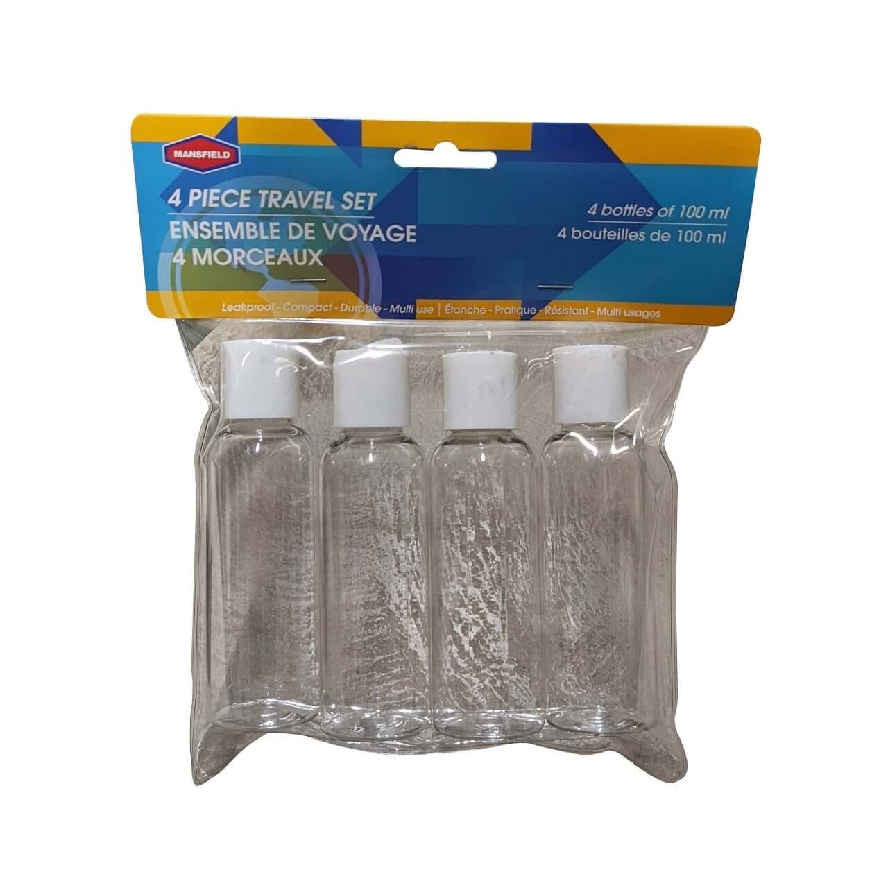 Description: Mansfield Travel Bottles are a convenient leakproof, compact, durable, multi-use solution for bringing your favourite personal care liquids on your travels. These bottles are 100 mL in volume, clear, with a white cap.
