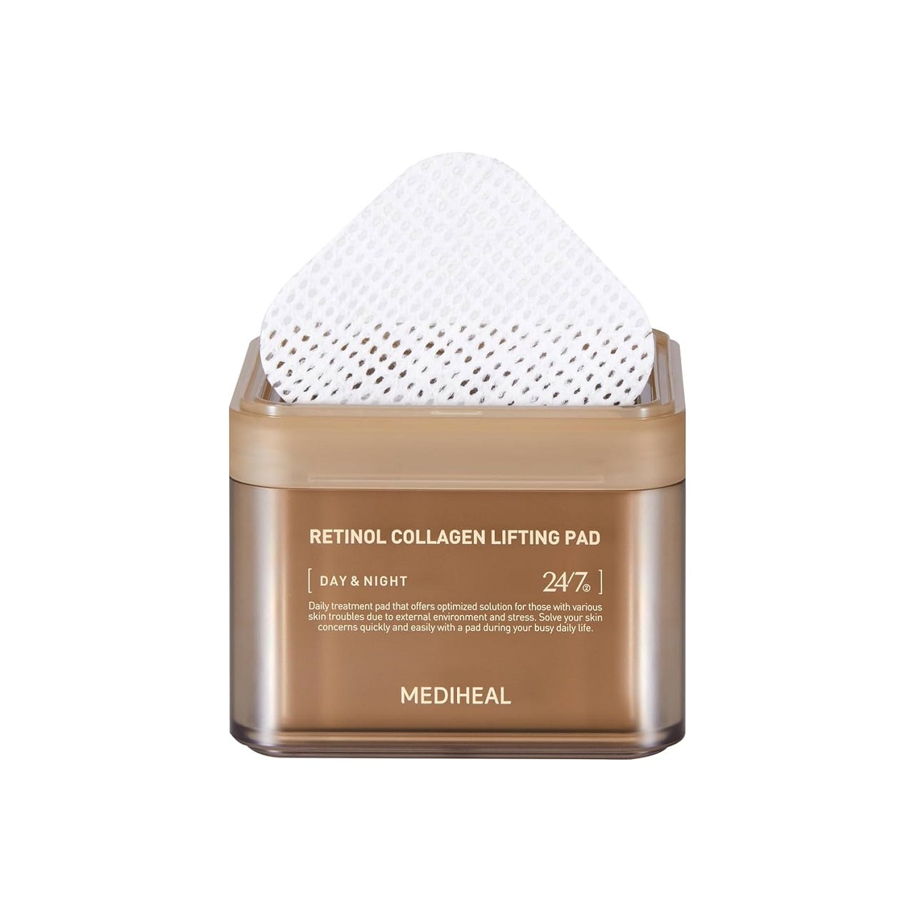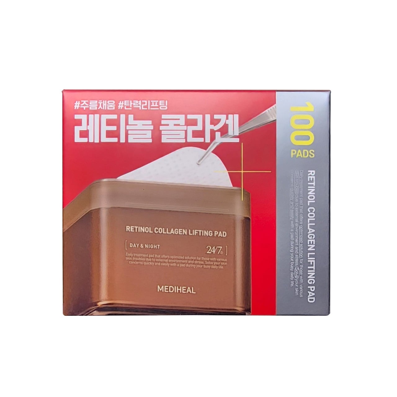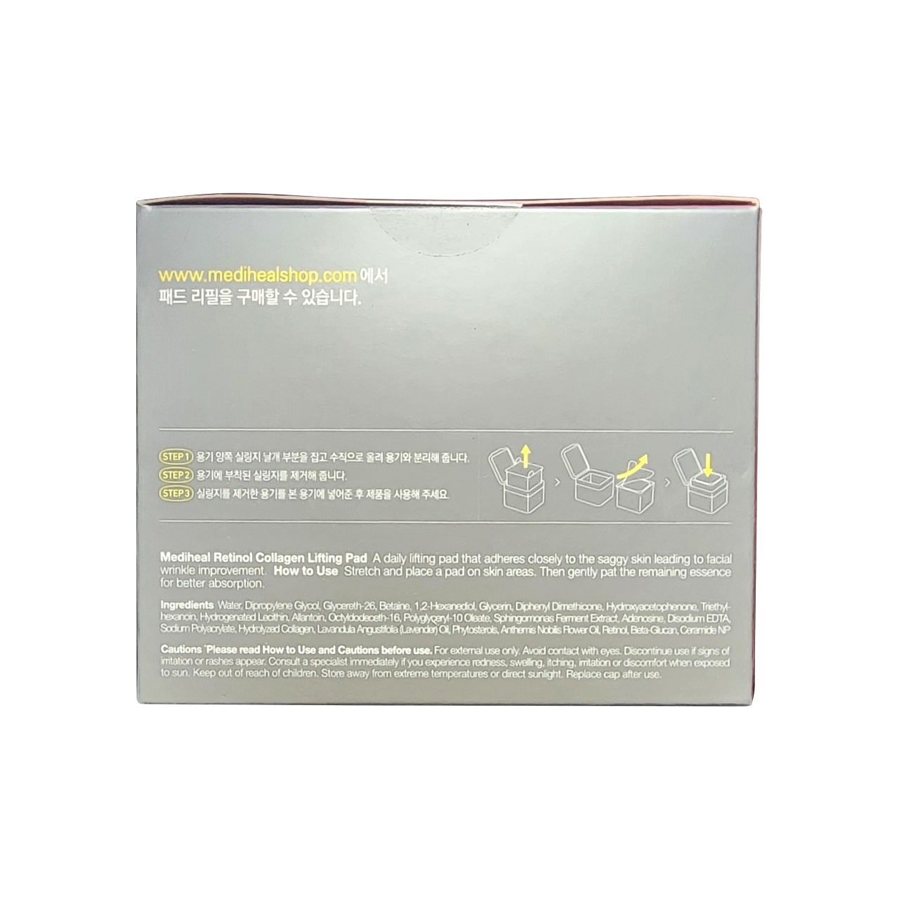 Description: Mediheal Retinol Collagen Lifting Pad is designed to lift and renew lackluster, sagging skin and help improve the appearance of fine lines and wrinkles. Retinol and collagen help to create a wrinkle-filling effect, yielding firmer, smoother looking skin.