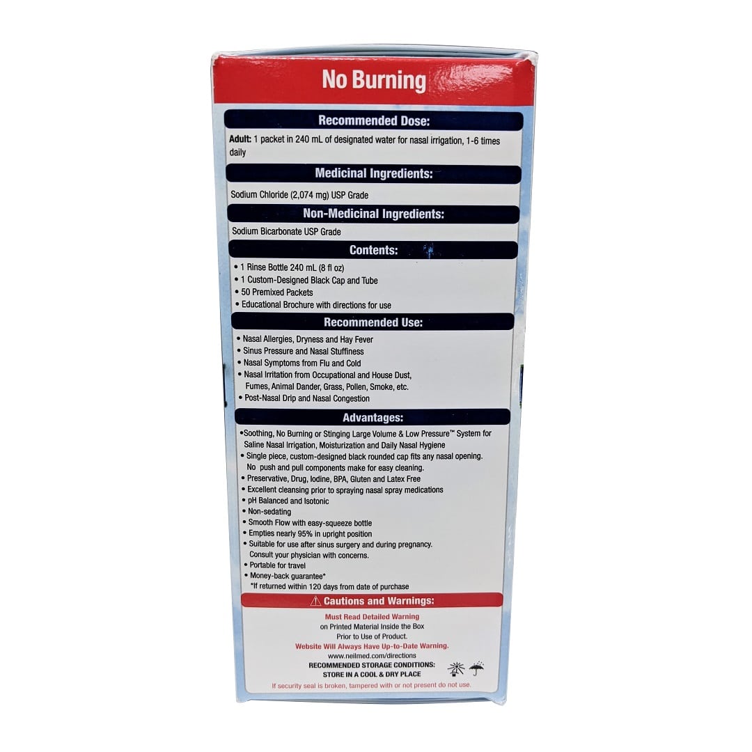 Description: Neilmed Sinus Rinse Kit is an easy to use, comfortable solution that allows you to flush your nasal passages with saline solution. This kit includes both the squeeze bottle needed for the nasal rinse and 50 premixed packets of sodium chloride and sodium bicarbonate.