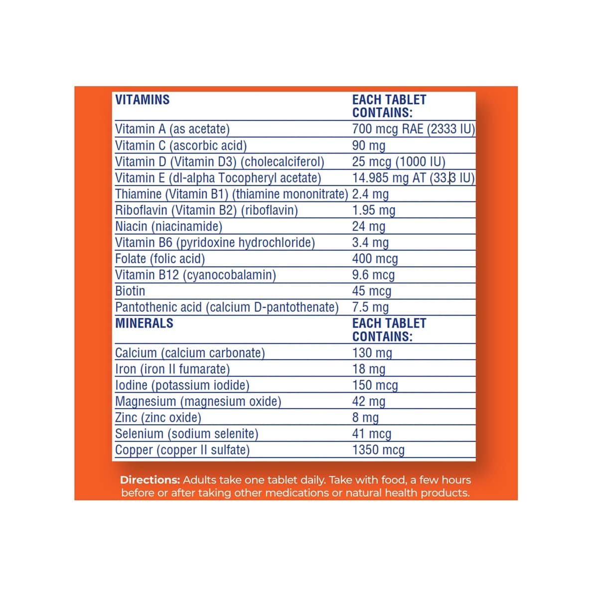 Directions for Adults: Take 1 tablet daily with food. Take a few hours before or a few hours after taking other medications.