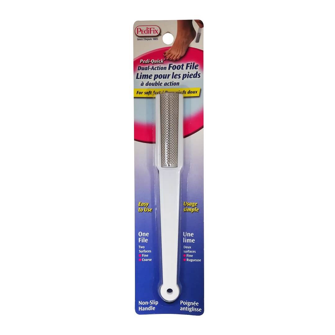 Description: PediFix Dual Action Foot File helps to remove corns and calluses for smoother, sleeker feet. A fine side helps to remove rough skin and easily shapes nails; a coarse side helps to easily and safely level corns and calluses.