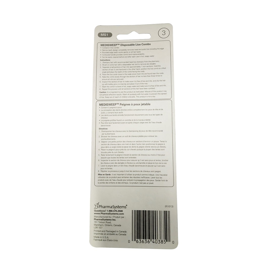 Description: PharmaSystems Medisweep Disposable Lice Comb contains 3 lice combs, which feature a narrow teeth design to completely remove head and pubic lice, including the eggs. The rounded edge teeth works gently on all hair types. These combs can be easily cleaned before and after each use in hot, soapy water.