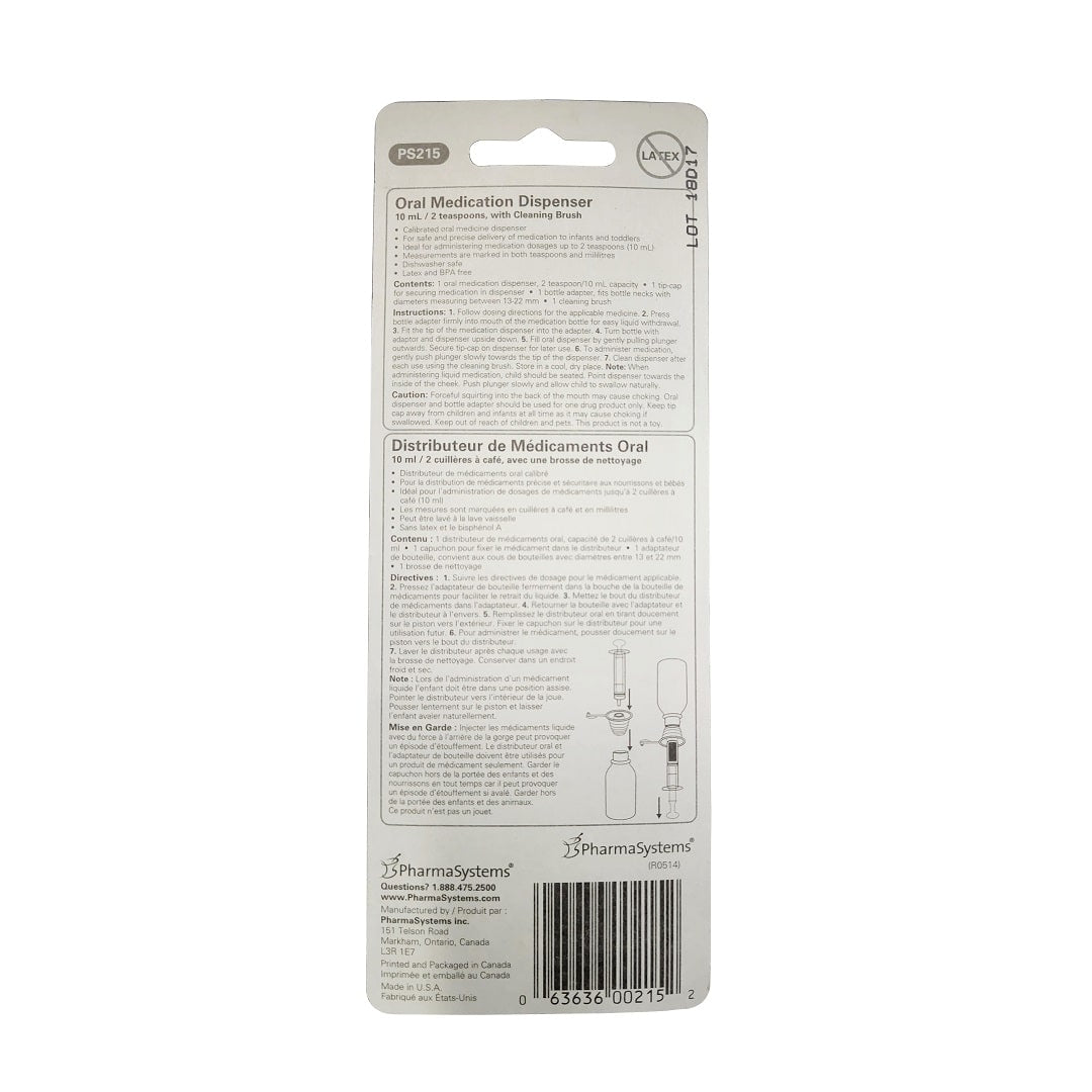 Description: PharmaSystems Oral Medication Dispenser is designed for safe and precise delivery of medication to infants and toddlers. This dispenser is ideal for administering dosages up to 2 teaspoons (10 mL). This dispenser comes with a brush for cleaning.