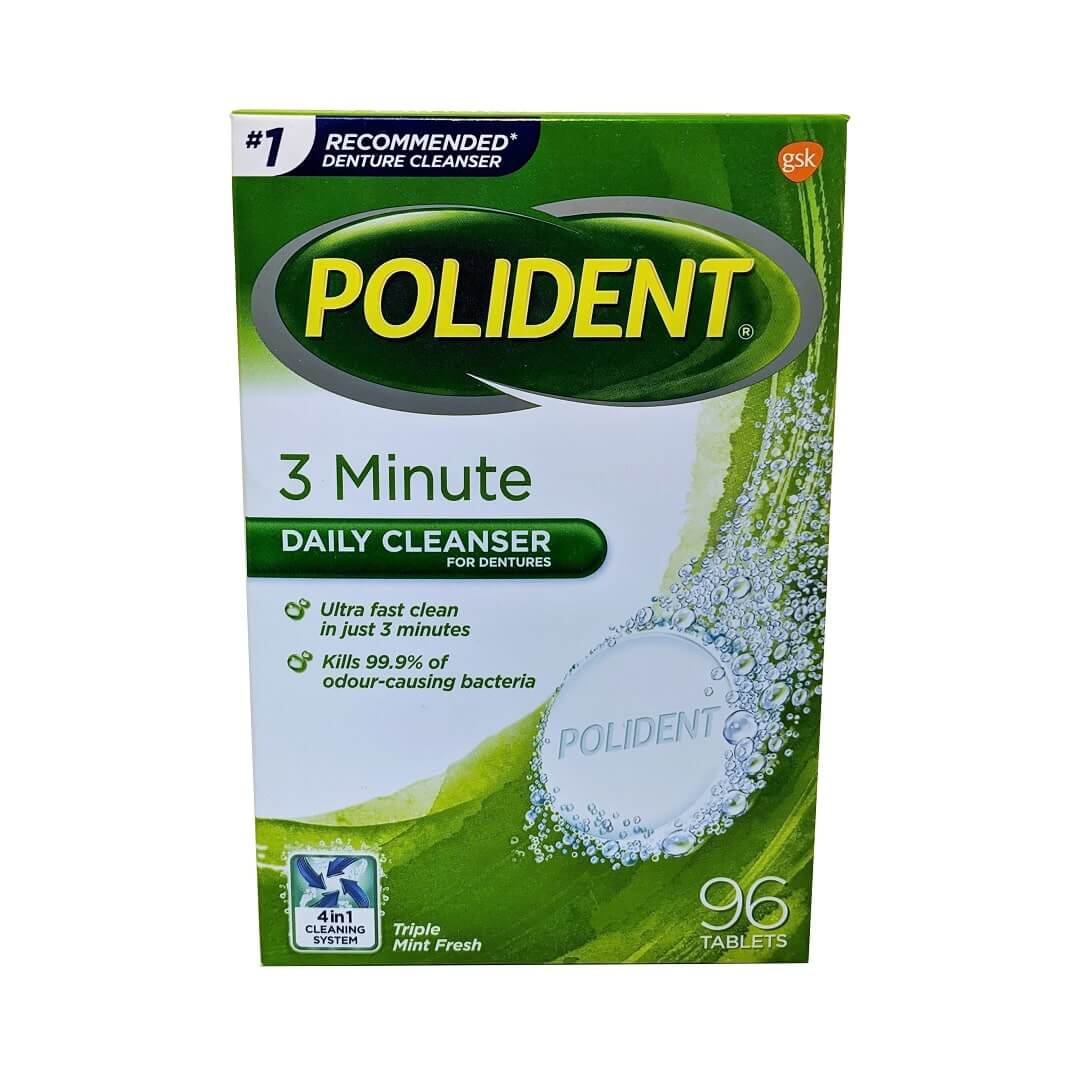 Description: Polident 3 Minute Daily Cleanser Triple Mint Fresh is ideal for those who are looking for a deep clean, without having to soak their dentures overnight. This denture cleanser cleanses in just 3 minutes and kills 99.9% of odour-causing bacteria.