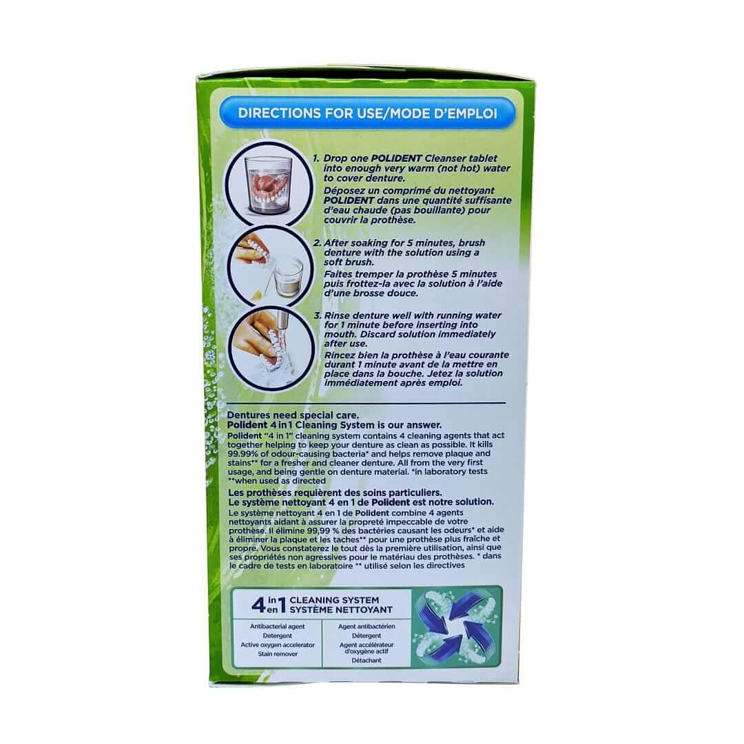 Description: Polident Whitening Daily Cleanser Triple Mint is a daily cleansing tablet that helps to kill 99.9% of odour-causing bacteria helps to reduce plaque and remove tough stains. This Polident tablet also features a whitening formula to leave your dentures looking fresh and bright everyday.