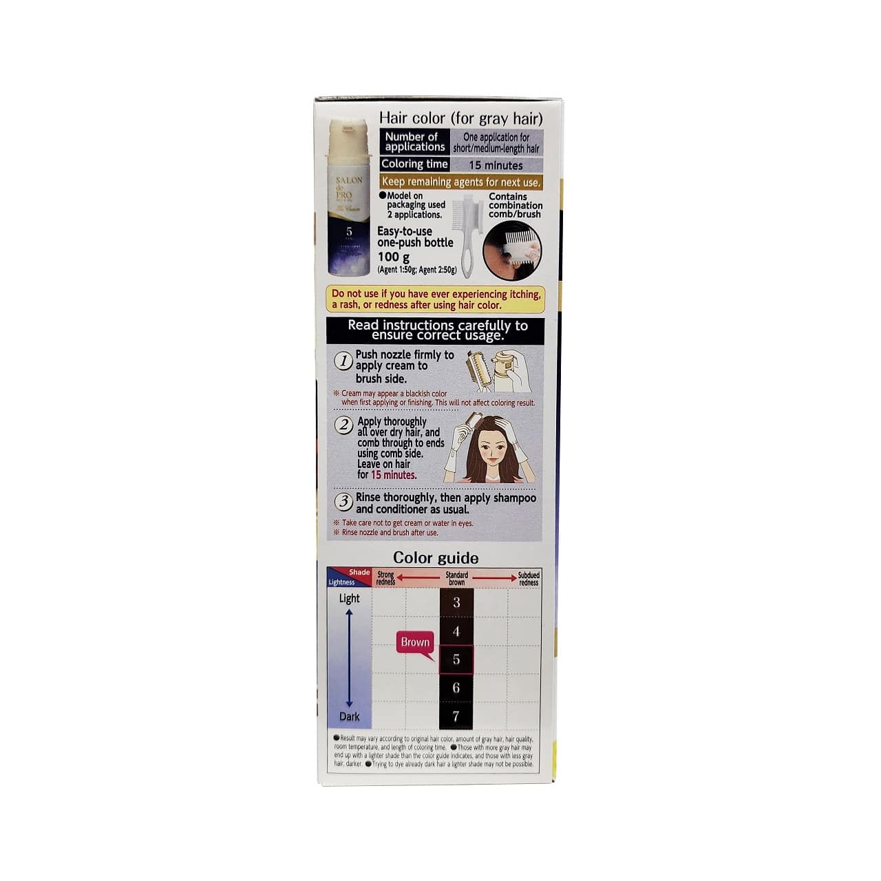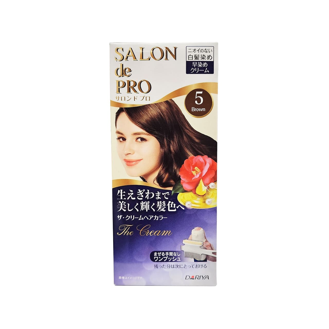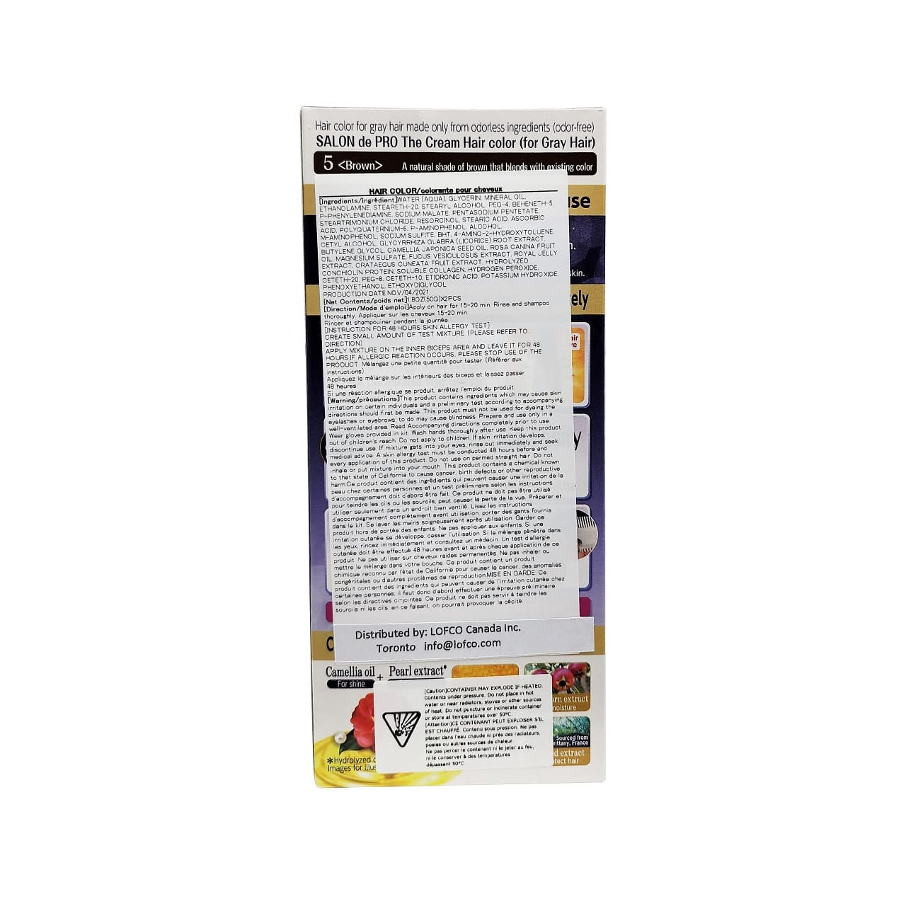 Description: Salon de Pro The Cream hair dye us a one-push, simple to use and easy to use solution that can dye your grey hair quickly in just 15 minutes! This hair dye is designed to be odor-removed. It also features a combination of 6 natural ingredients for beautiful, dyed hair: camelia oil for shine, pearl extract for hydration, rosehip oil for gloss, hawthorn extract for moisture, royal jelly extract for moisture, and seaweed extract for protection. In a one-push bottle, two agents are conveniently dispensed at the same time - no powders or mixing involved. Colour is #5 Brown.