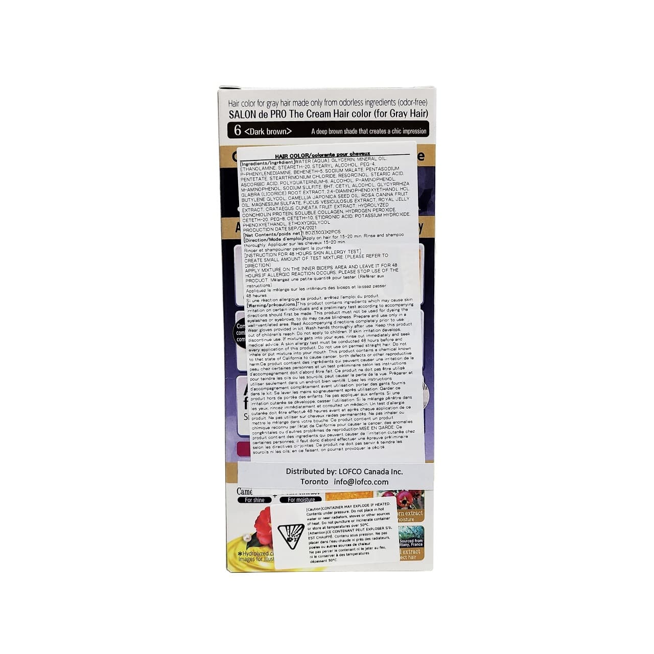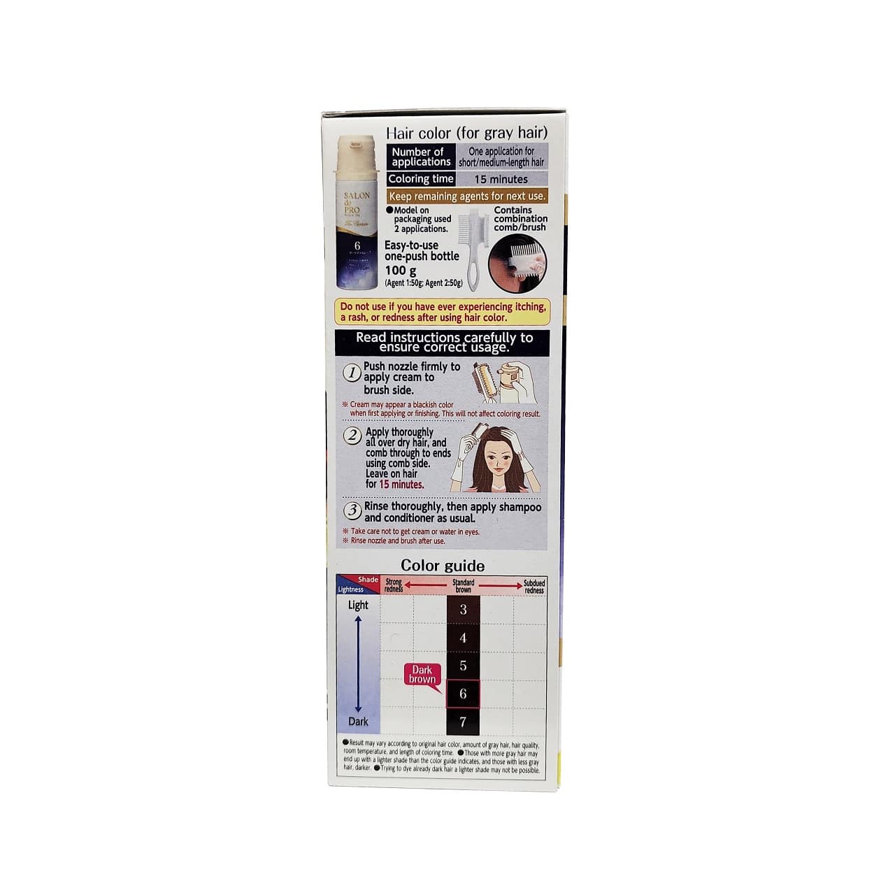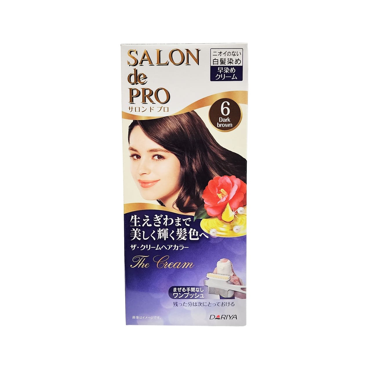 Description: Salon de Pro The Cream hair dye us a one-push, simple to use and easy to use solution that can dye your grey hair quickly in just 15 minutes! This hair dye is designed to be odor-removed. It also features a combination of 6 natural ingredients for beautiful, dyed hair: camelia oil for shine, pearl extract for hydration, rosehip oil for gloss, hawthorn extract for moisture, royal jelly extract for moisture, and seaweed extract for protection. In a one-push bottle, two agents are conveniently dispensed at the same time - no powders or mixing involved. Colour is #6 Dark Brown.