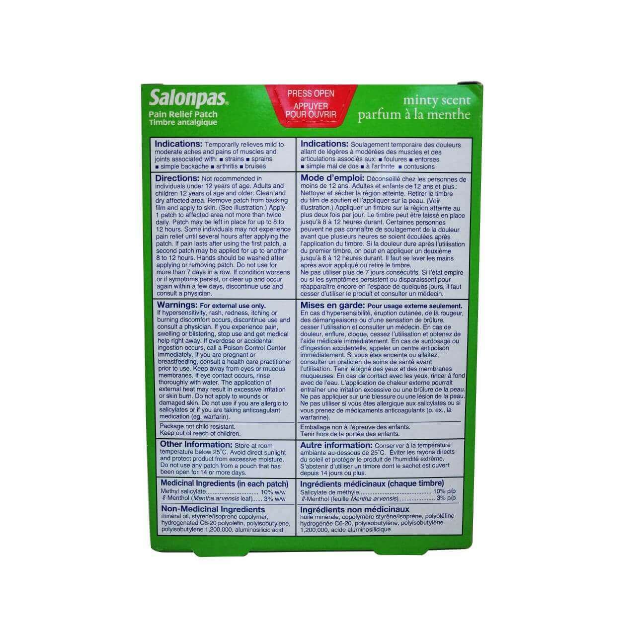 Description: Salonpas Pain Relief Patches are a convenient solution for effective temporary pain relief. This formulation has been proven to provide 12 hours of relief for mild to moderate aches and pains in the shoulder, neck, back, muscles, and joints. Each patch is 7cm x 10cm in size and is designed to be stretchable and flexible for comfort.