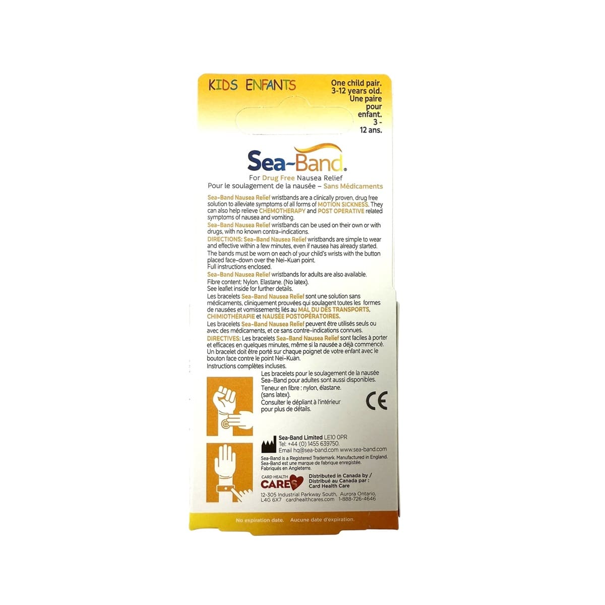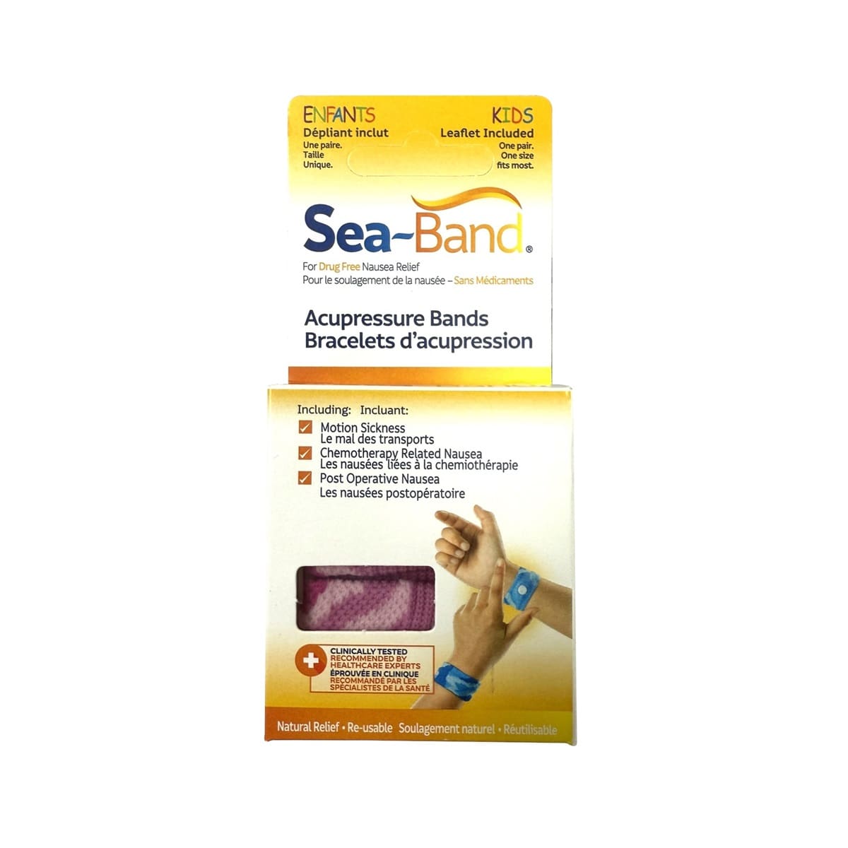 Description: Sea-Band Children's Wristbands provide natural relief of travel and motion sickness and helps alleviate symptoms of nausea and vomiting associated with motion sickness, chemotherapy, and post operative nausea, without causing drowsiness or other side effects. Sea-Band works by applying pressure on the Nei Kuan acupressure point. The bands can be put on to your wrists before you start travelling, or at any time during your journey.