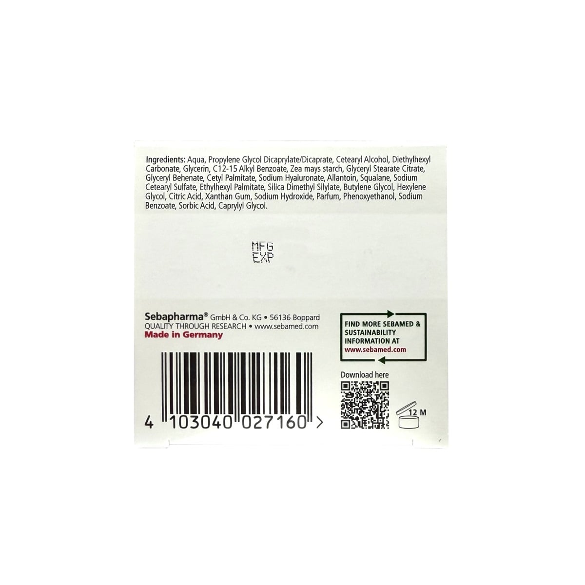 Ingredients: Aqua, Propylene Glycol Dicaprylate/Dicaprate, Cetearyl Alcohol, Diethylhexyl Carbonate, Glycerin, C12-15 Alkyl Benzoate, Zea mays starch, Glyceryl Stearate Citrate, Glyceryl Behenate, Cetyl Palmitate, Sodium Hyaluronate, Allantoin, Squalane, Sodium Cetearyl Sulfate, Ethylhexyl Palmitate, Silica Dimethyl Silylate, Butylene Glycol, Hexylene Glycol, Citric Acid, Xanthan Gum, Sodium Hydroxide, Parfum, Phenoxyethanol, Sodium Benzoate, Sorbic Acid, Caprylyl Glycol.