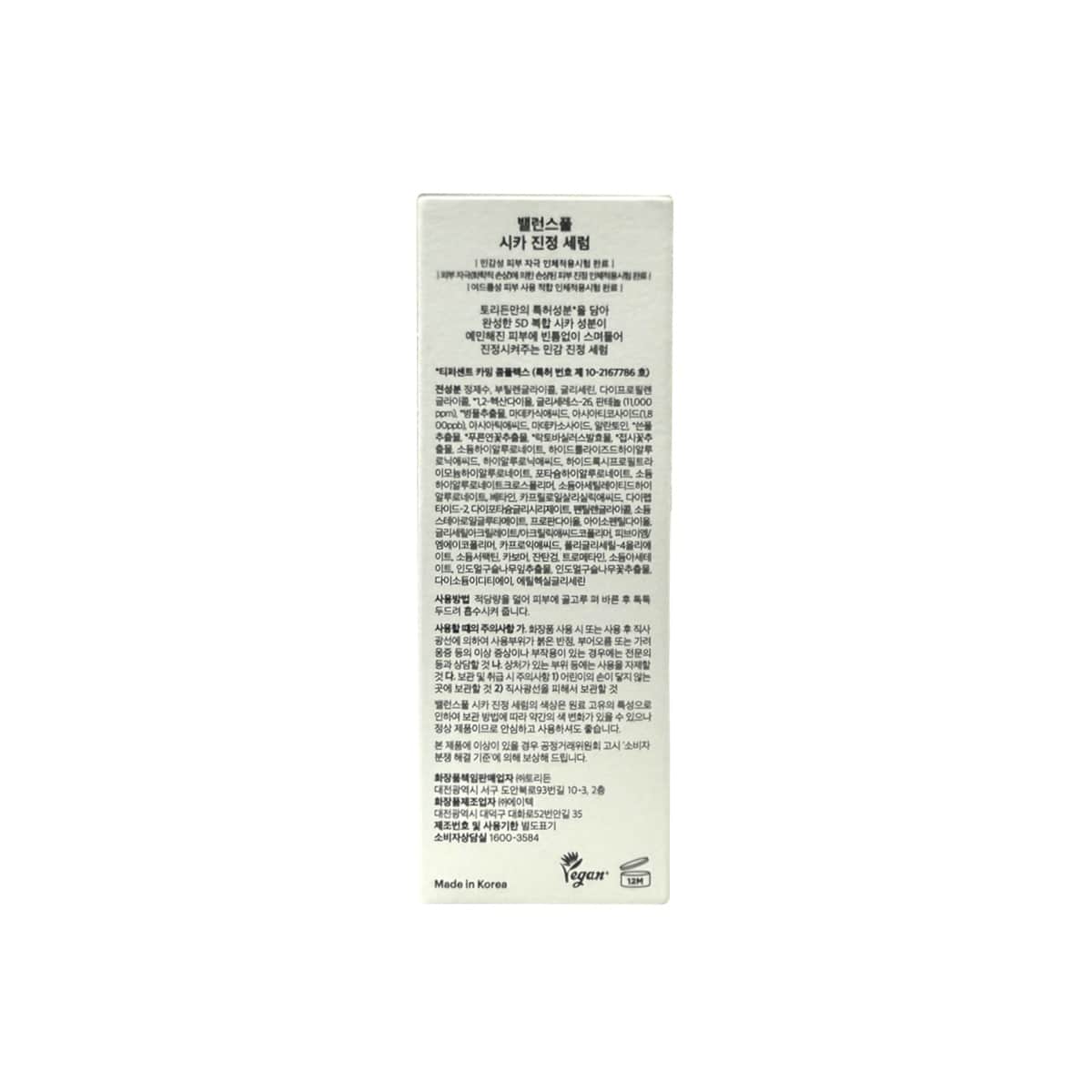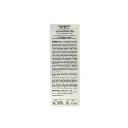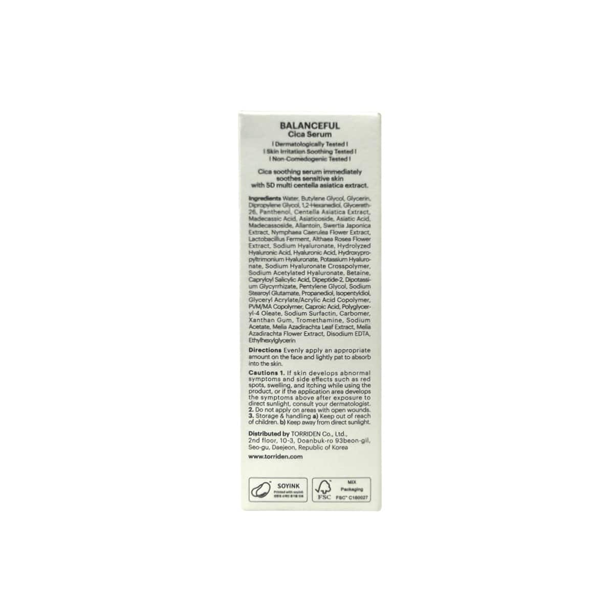 Description: Torriden Balanceful Cica Serum is designed to soothe, protect, and restore sensitive skin. It features Torriden's 5D Complex Cica Complex, which helps calm and comfort irritated skin, and T-TECA Drop System, which helps delivers soothing ingredients like asiatic acid, madecassic acid, and asiaticoside directly to the skin. Its hypoallergenic, weakly acidic composition is ideal for managing oil and moisture balance, particularly in sensitive skin types.