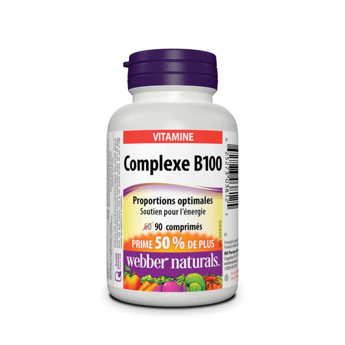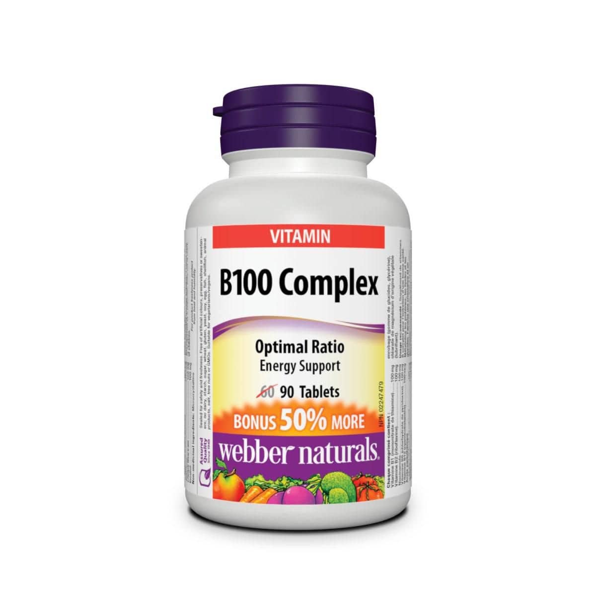 Description: webber naturals B100 Complex supplement helps to convert proteins, fats, and carbohydrates into energy. B vitamins are necessary for the eyes, nerves, and immunity, and help to maintain our bodily functions. This supplement provides 100 mg of most B vitamins, in addition to a few supportive nutrients.