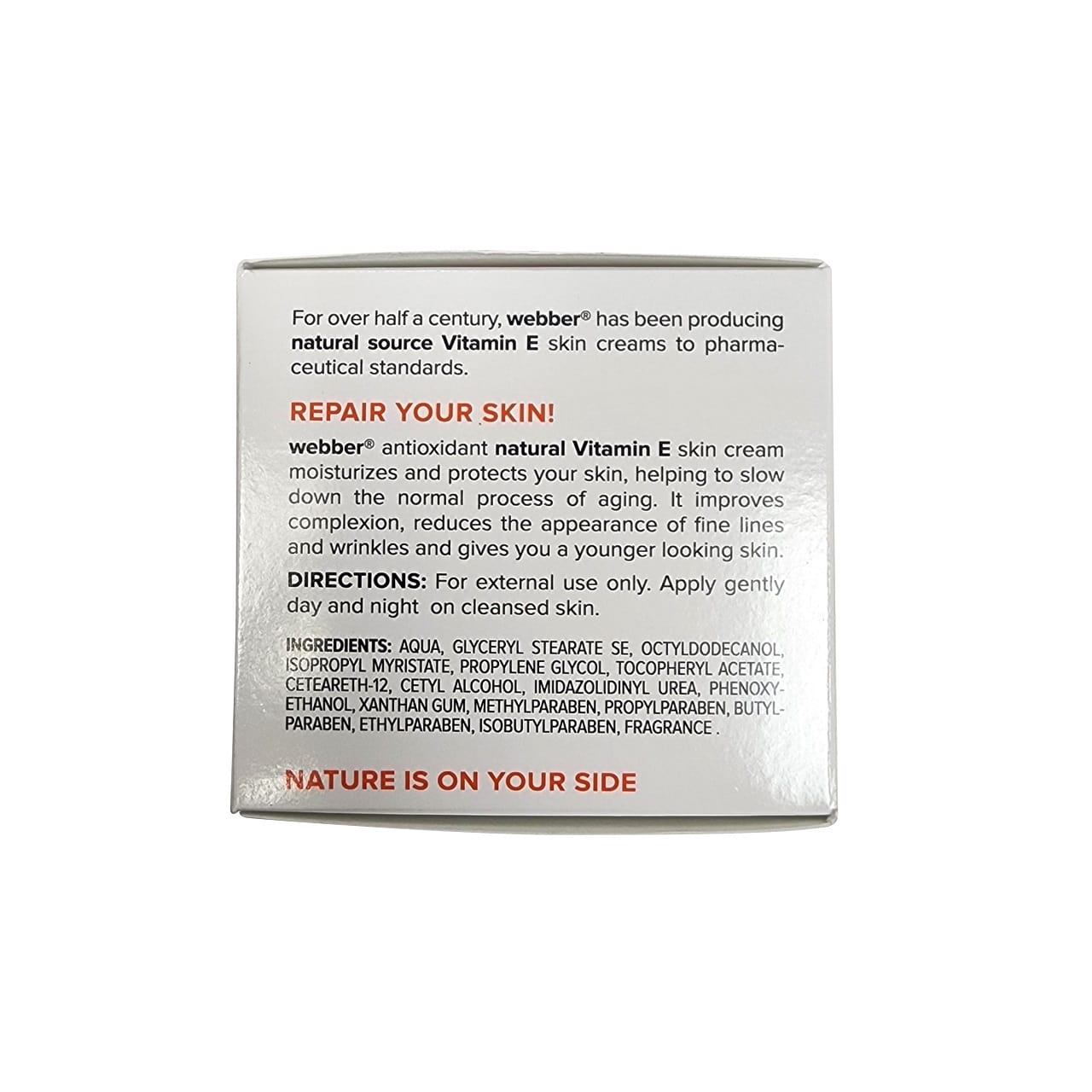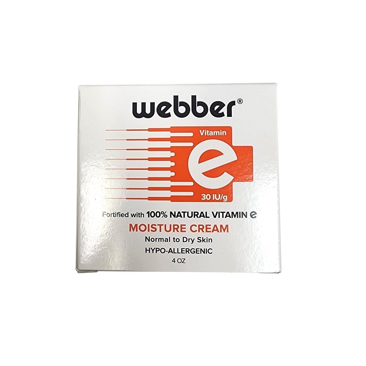 Description: Webber Vitamin E Moisture Cream moisturizes and protects your skin, helping to slow the normal process of aging. It improves complexion, reduces appearance of fine lines and wrinkles and gives you younger looking skin. This moisture cream is formulated with natural vitamin E and is for normal to dry skin.